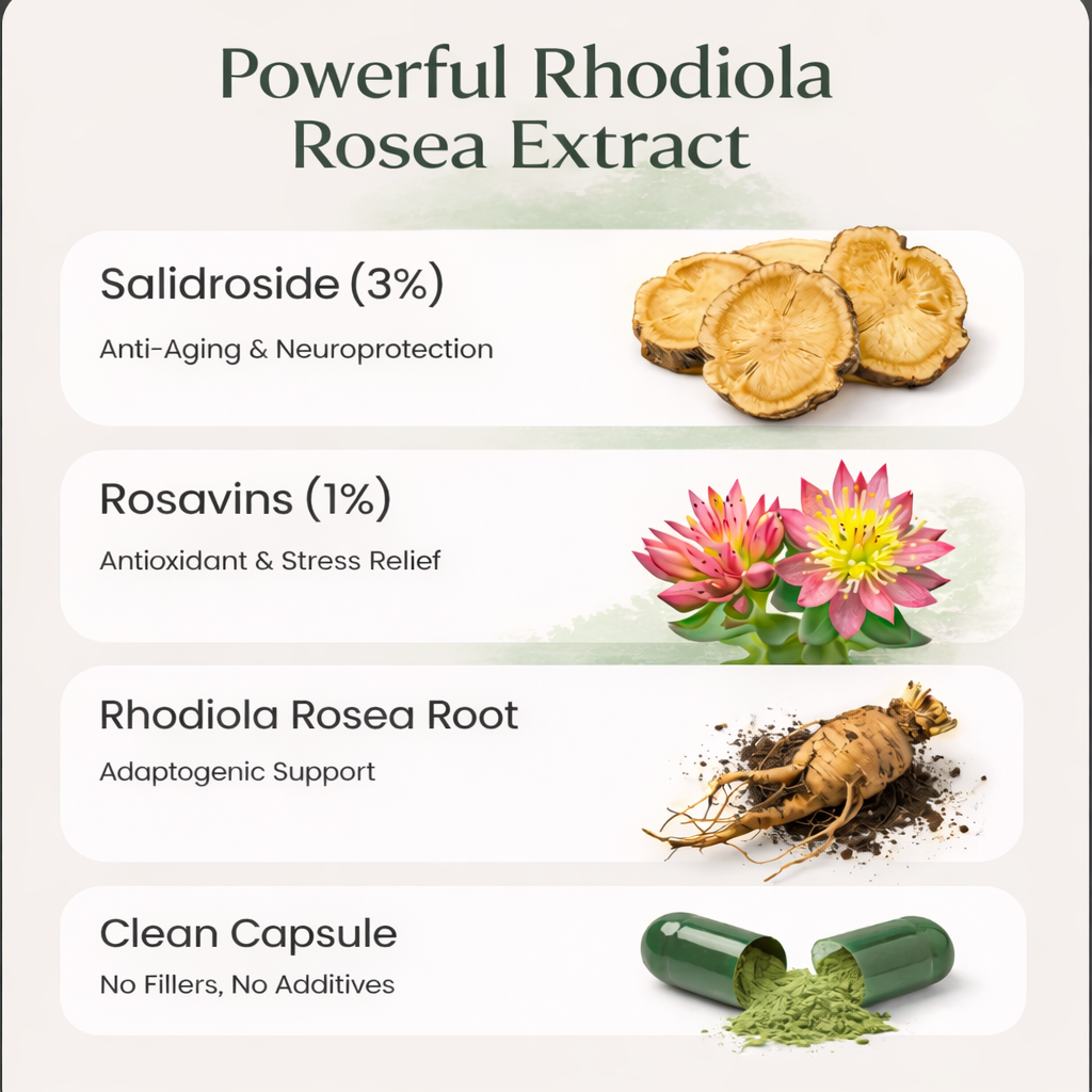 Our premium Rhodiola Rosea formula is designed to help you stay calm under pressure, think clearly, and maintain steady energy throughout your day—without crashes or jitters.
