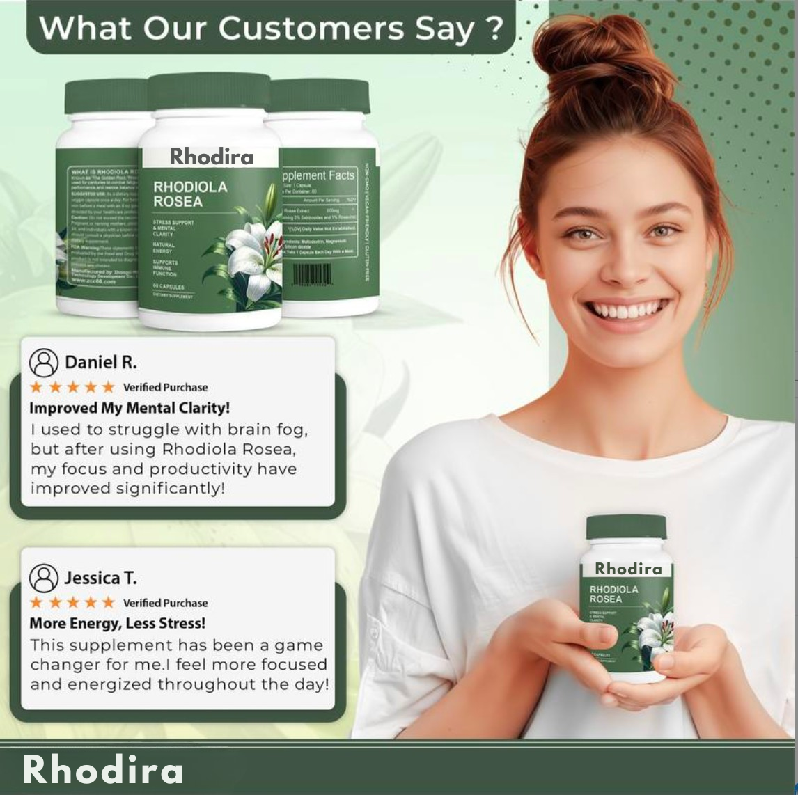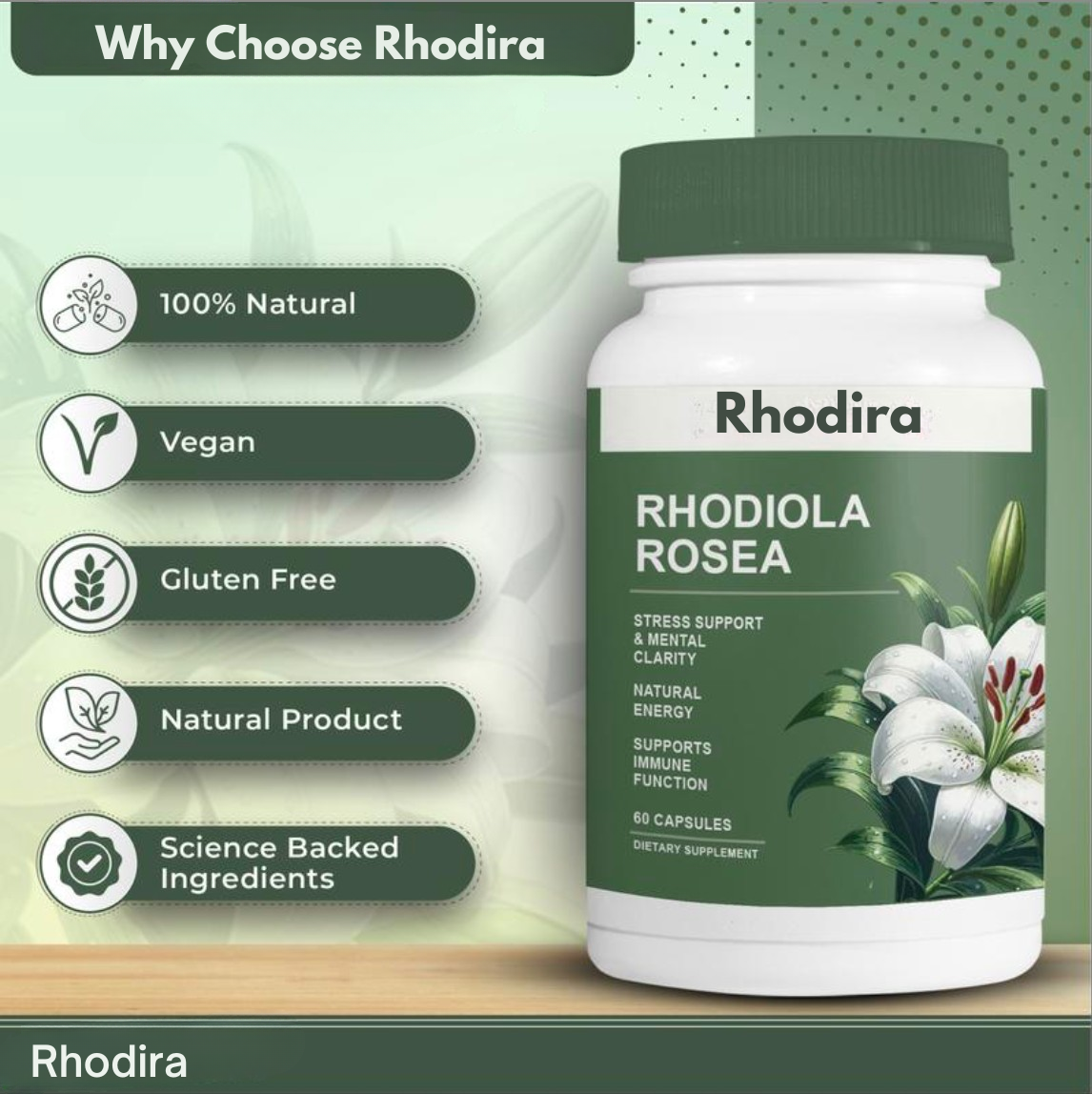 Rhodira is powered by a potent Rhodiola Rosea extract standardized for key active compounds like salidroside and rosavins—known for supporting stress relief, mental clarity, and sustained energy.